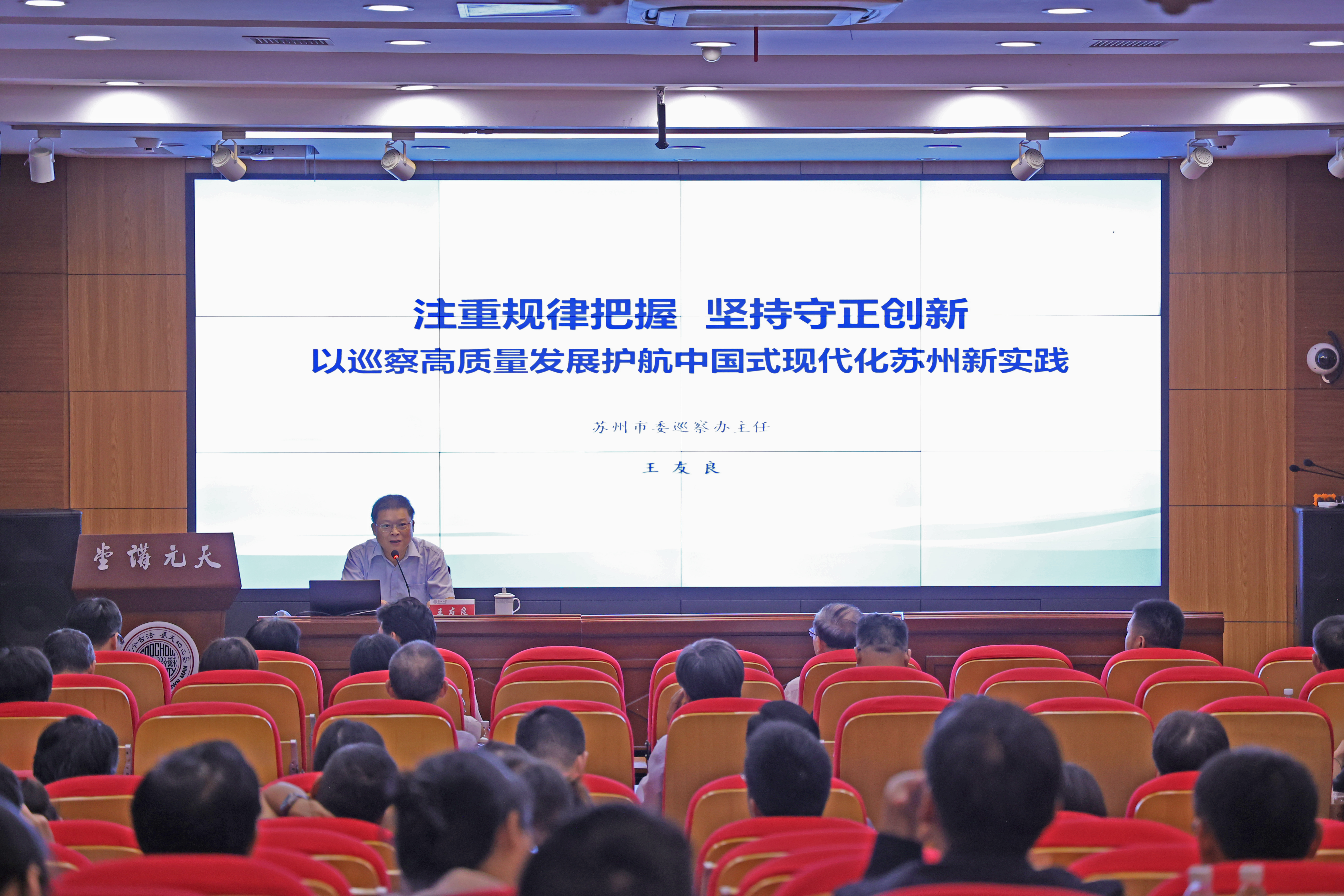 本次培训邀请到市纪委常委、市监委委员,市委巡察办主任王友良作专题辅导报告。报告以《注重规律把握,坚持守正创新,以巡察高质量发展护航中国式现代化苏州新实践》为题,结合苏州市委巡察工作实际,从政治巡视巡察的内涵要求、如何更好开展高校巡察工作、巡视巡察高校发现的重点问题、苏州巡察工作现状等四个方面进行了深入浅出的讲解,为我校巡察工作传授了宝贵的经验。
