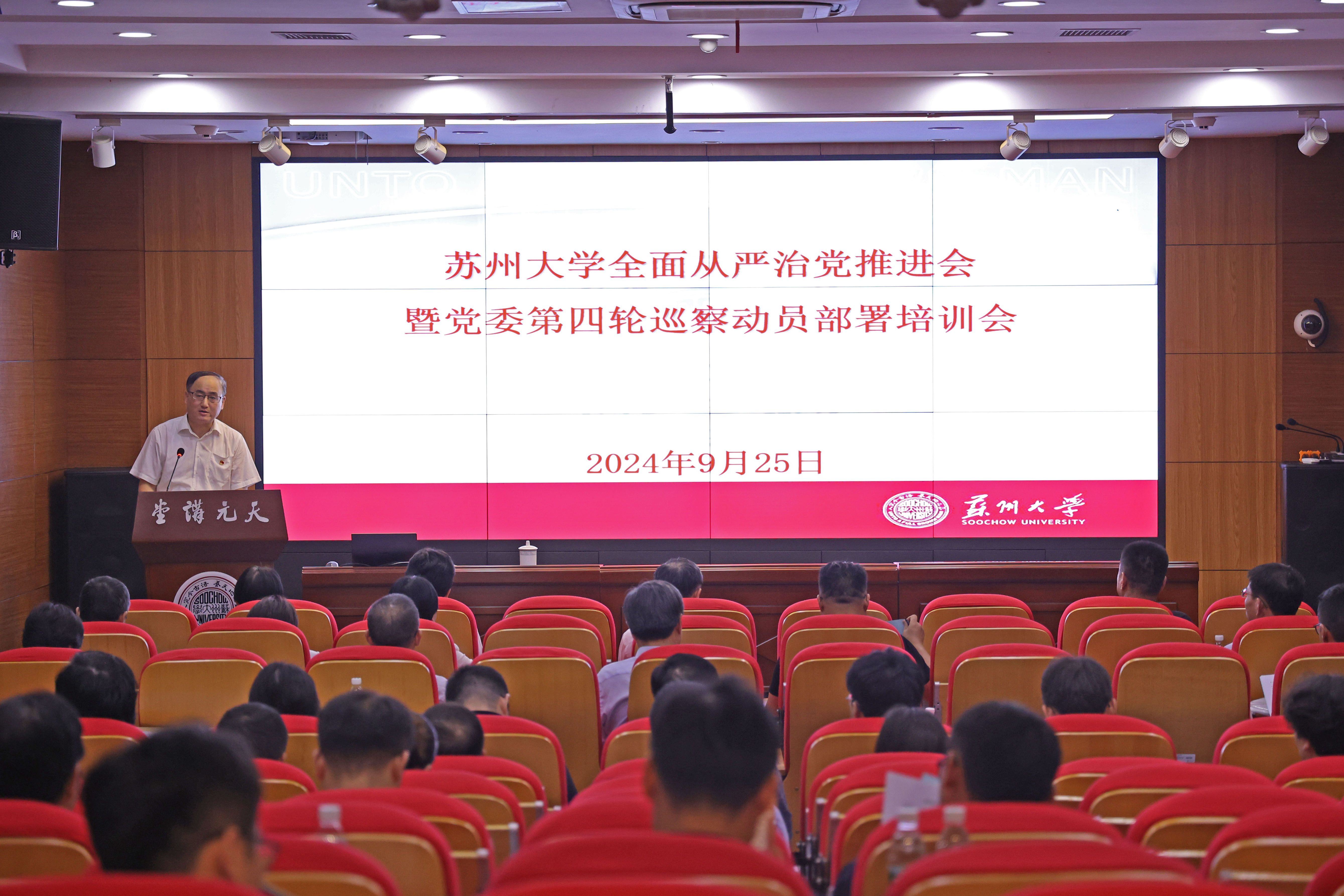 为纵深推进全面从严治党,扎实推动巡察工作高质量发展,9月25日下午,苏州大学全面从严治党推进会暨第四轮巡察动员部署培训会在天元大讲堂召开。校党委书记、巡察工作领导小组组长张晓宏出席会议并讲话。校党委巡察工作领导小组成员,第四轮巡察各巡察组全体成员及被巡察党组织相关人员参加会议。会议由校党委常委、纪委书记、派驻监察专员、巡察工作领导小组副组长宫向阳主持。