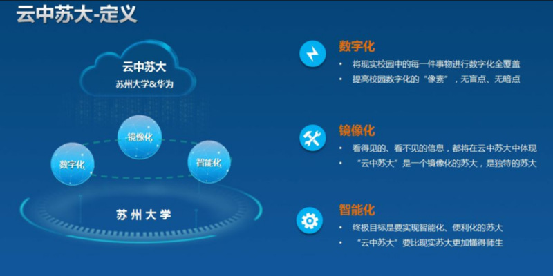首先,要有行业数字化变革的东风。2018年4月教育部印发了《教育信息化2.0行动计划》的通知,加快了教育现代化和教育强国的建设,同时也带来了新的机遇。正是在这样的背景下,在2018年10月,苏州大学与华为公司签署战略合作框架协议。由此开启了打造数字化、镜像化、智能化的云中大学之旅。