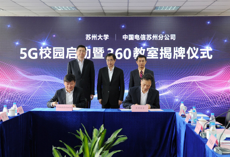 唐文学副总经理和杨一心副校长代表双方签署苏州大学·中国电信苏州分公司5G校园战略行动方案。